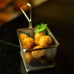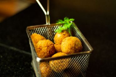 Bolinhos de batata com pinhão recheados com truta defumada.