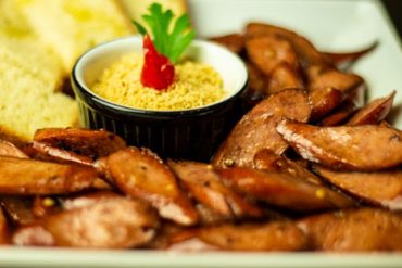 Linguiça mista flambada na cachaça. Acompanha fatias de pão e farofa.
