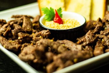 Picadinho de Contra-file. Acompanha pão e farofa.